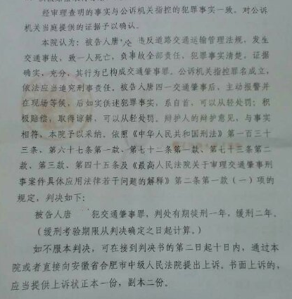 近日,安徽金亞太律師事務(wù)所蘇義飛律師代理的一起交通肇事罪案件迎來一審判決。在蘇律師的全力辯護下,被告人唐某某雖因交通肇事致一人死亡,但因具備自首、積極賠償并取得諒解等從寬情節(jié),最終被法院依法判處緩刑,得以回歸家庭、回歸社會。