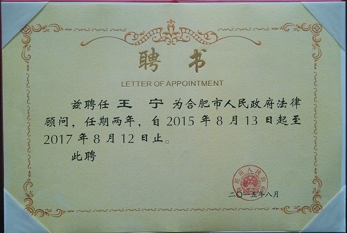 2015年8月13日,合肥市人民政府頒發(fā)聘書,決定聘請(qǐng)我所王寧、鮑進(jìn)律師為市政府常年法律顧問,聘期為兩年。我所王寧律師自2011年起延任至今,鮑進(jìn)律師自2004年擔(dān)任合肥市人民政府首屆法律顧問以來延任至今。
