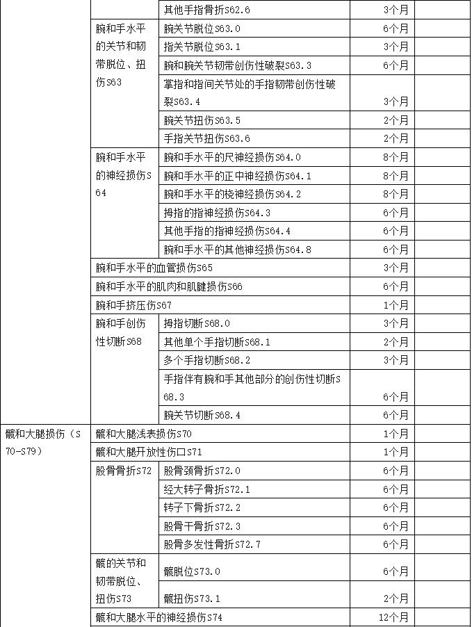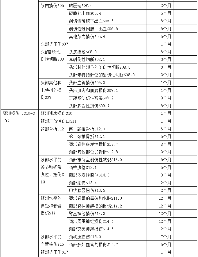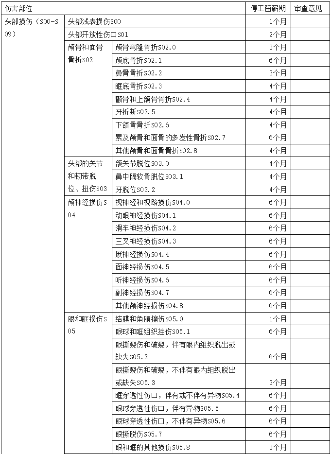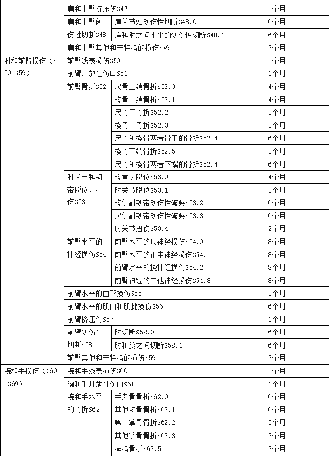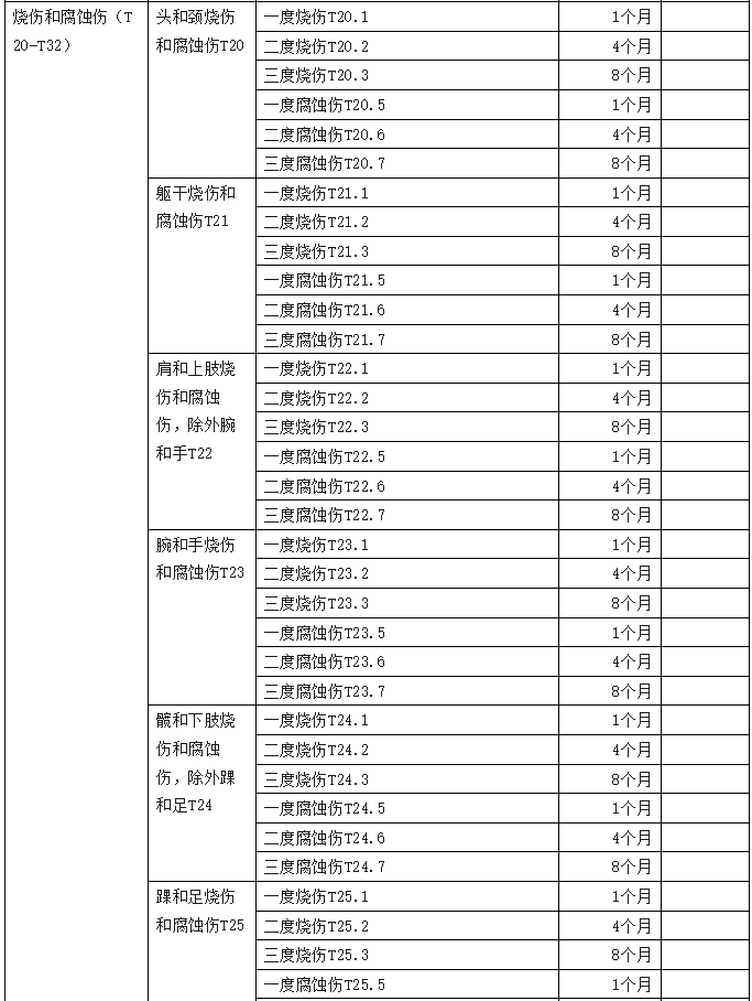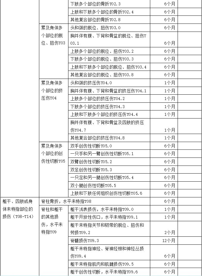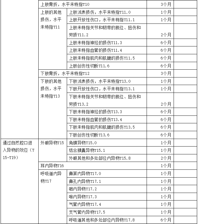 2、傷害部位按國際疾病分類(ICD—10)中的損傷類型,分為頭部損傷;頸部損傷;胸部損傷;腹部、腰背部、腰椎和骨盆損傷;肩和上臂損傷;肘和前臂損傷;腕和手損傷;髖和大腿損傷;膝和小腿損傷;踝和足損傷;身體多部位損傷;軀干、四肢或未特指部位損傷;異物滯留;燒傷和化學灼傷;凍傷等十五類,共列傷害部位441條。各傷害部位編碼是按ICD—10中的編碼進行編排。職業(yè)病分列七類,61種常見職業(yè)病,各類中毒51種。有些臨床發(fā)病較少職業(yè)病種未列其中,可根據(jù)職業(yè)病專家的意見確定停工留薪期。