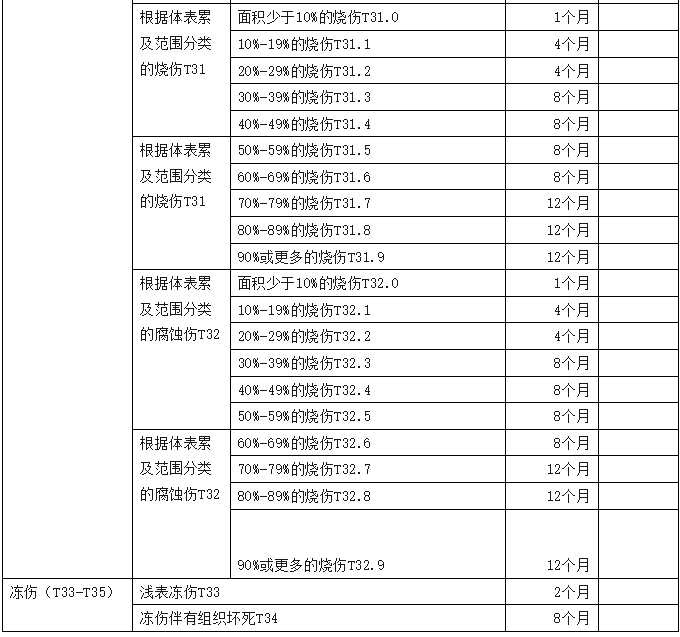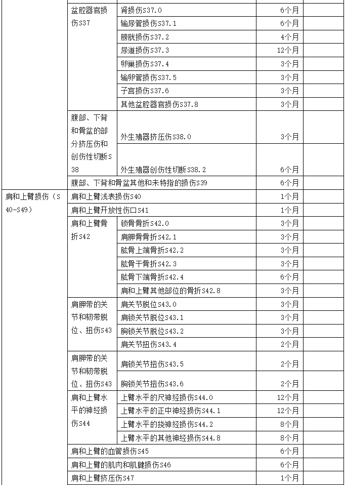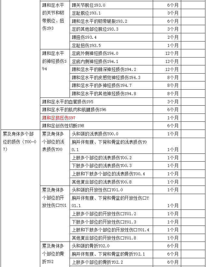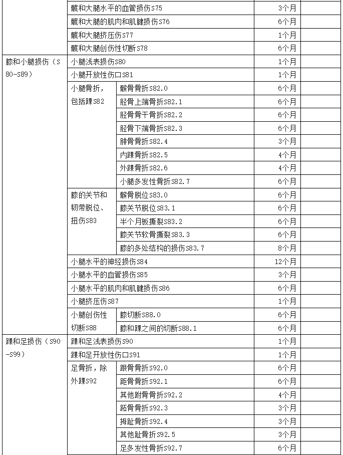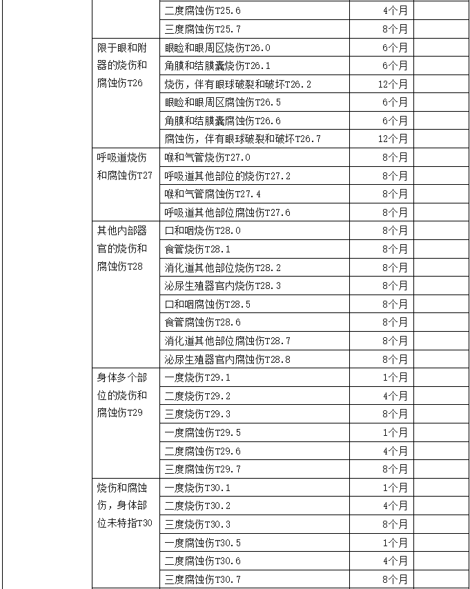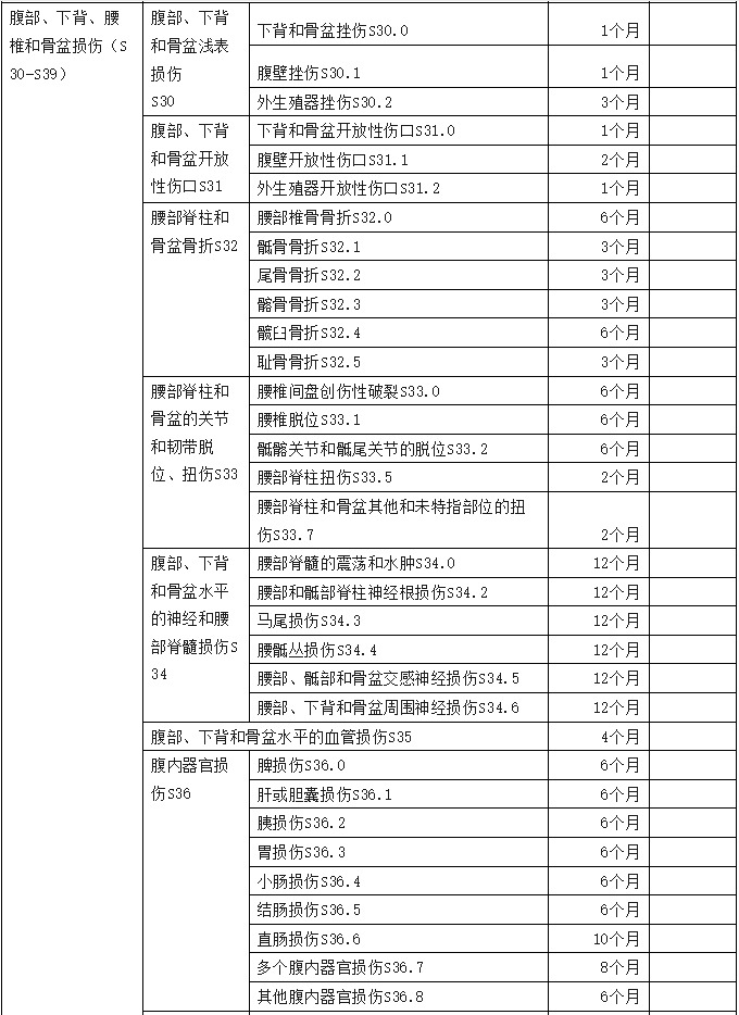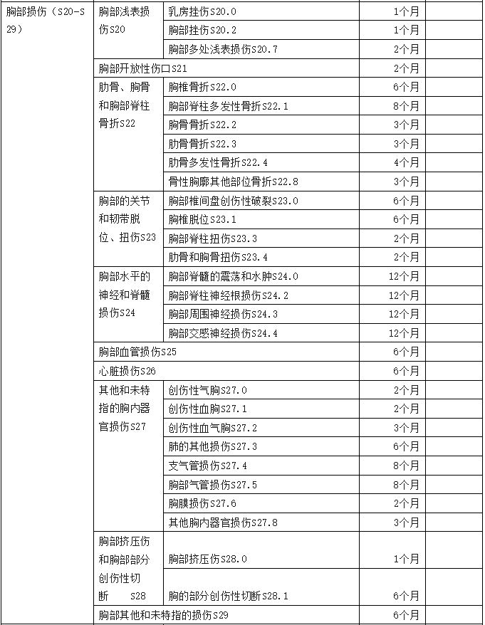 2、傷害部位按國際疾病分類(ICD—10)中的損傷類型,分為頭部損傷;頸部損傷;胸部損傷;腹部、腰背部、腰椎和骨盆損傷;肩和上臂損傷;肘和前臂損傷;腕和手損傷;髖和大腿損傷;膝和小腿損傷;踝和足損傷;身體多部位損傷;軀干、四肢或未特指部位損傷;異物滯留;燒傷和化學灼傷;凍傷等十五類,共列傷害部位441條。各傷害部位編碼是按ICD—10中的編碼進行編排。職業(yè)病分列七類,61種常見職業(yè)病,各類中毒51種。有些臨床發(fā)病較少職業(yè)病種未列其中,可根據(jù)職業(yè)病專家的意見確定停工留薪期。