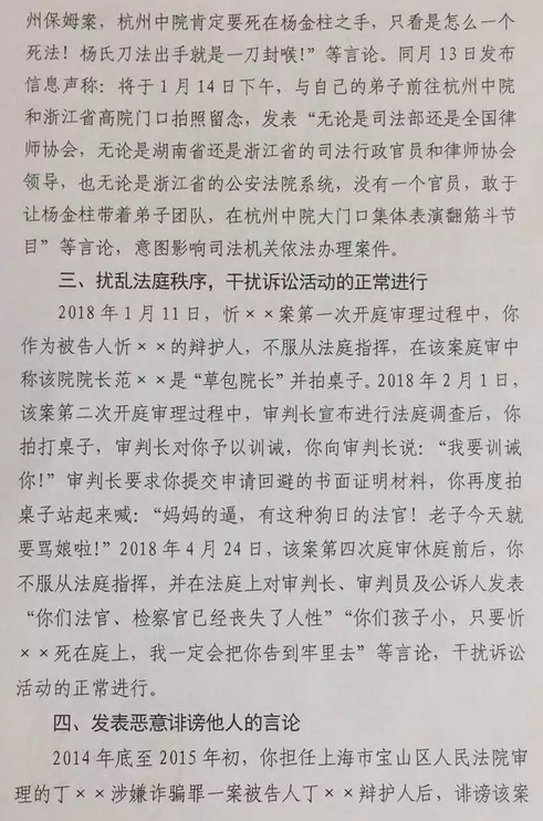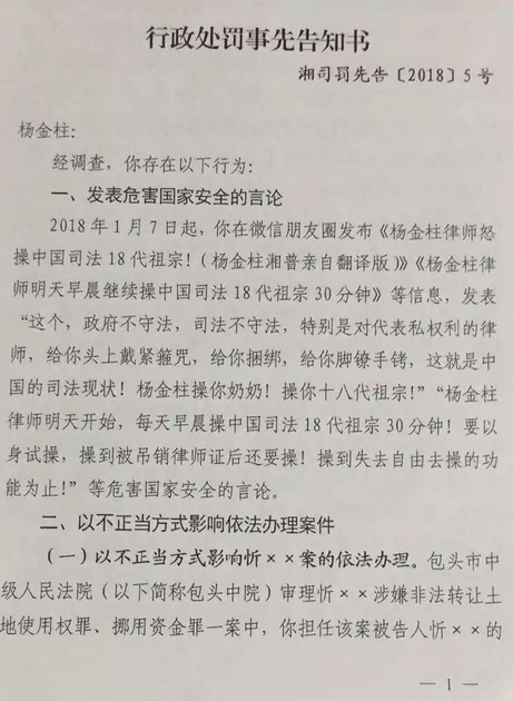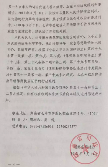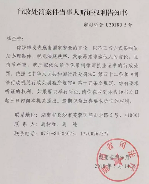 你涉嫌發(fā)表危害國家安全的言論,以不正當(dāng)方式影響依法辦理案件,擾亂法庭鐵序、發(fā)表惡意誹謗他人的言論,且情節(jié)嚴(yán)重,我廳擬依法給予你吊銷律師執(zhí)業(yè)證書的行政處罰。依照《中華人民共和國行政處罰法》第四十二條和《司法行政機(jī)關(guān)行政處罰程序規(guī)定》第十五條之規(guī)定,你有要求聽證的權(quán)利,如果要求舉行聽證,請你在收到本告知書之日起三日內(nèi)向本機(jī)關(guān)提出。逾期視為放棄要求聽證的權(quán)利,