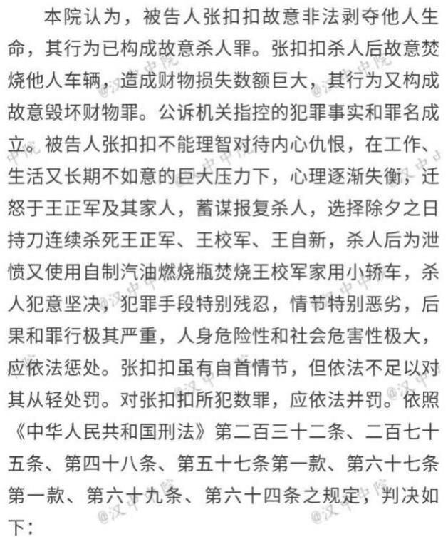 最終,法院認(rèn)定:張扣扣不能理智對待內(nèi)心仇恨,在工作、生活又長期不如意的巨大壓力下,心理逐漸失衡,遷怒于王正軍及其家人,蓄意報(bào)復(fù)殺人,犯罪手段特別殘忍,情節(jié)特別惡劣,決定適用死刑。不過,死刑判決還沒有生效,張扣扣還有上訴的權(quán)利。
