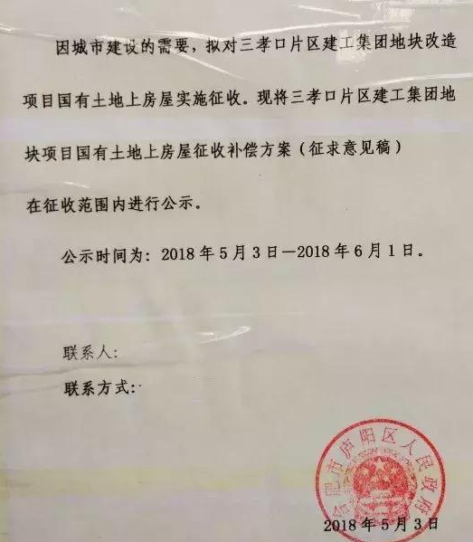 因城市建設需要,擬對三孝口片區(qū)建工集團地塊項目國有土地上房屋實施征收?,F(xiàn)將三孝口片區(qū)建工集團地塊項目國有土地上房屋征收補償方案(征求意見稿)在征收范圍內(nèi)進行公示。