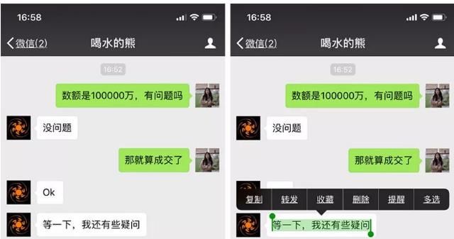 下面是一段微信聊天記錄,左邊是原始內(nèi)容,右邊是刪除對方一些回復(fù)的操作: